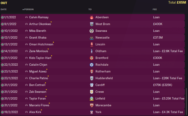 I also flogged off a couple of reserves who weren’t going to make the grade. Several youngsters were sent on loan, including playmaker Charlie Patino to Huddersfield and striker Mika Biereth to Swansea. Midfielder Miguel Azeez and wide attackers Marcelo Flores and Omari Hutchinson were among those being sent to League One clubs.