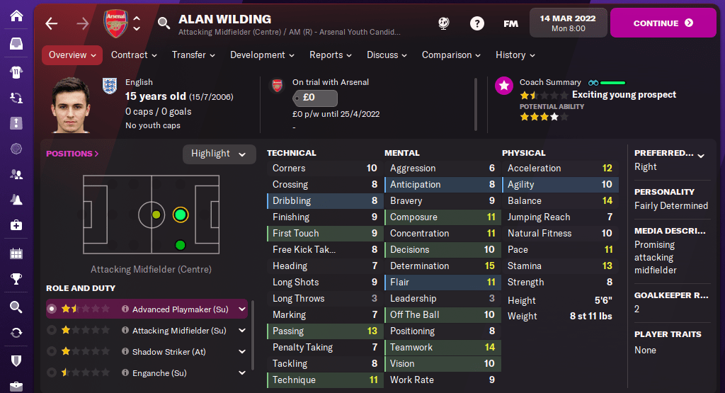 Alan Wilding is the AMC that Per was so excited about back in December. He’s not even 16 yet, but already has good passing and teamwork, and has a bit of flair to his game. There’s a lot of potential for growth here.