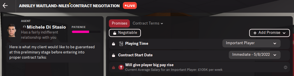 I was even less happy to lose Ainsley Maitland-Niles as a homegrown right-back, but he kinda forced my hand. Having come back from a season at Roma, Maitland-Niles wanted reassurances about his long-term future, especially as he was in the final year of his contract. So, I opened negotiations about a new deal…