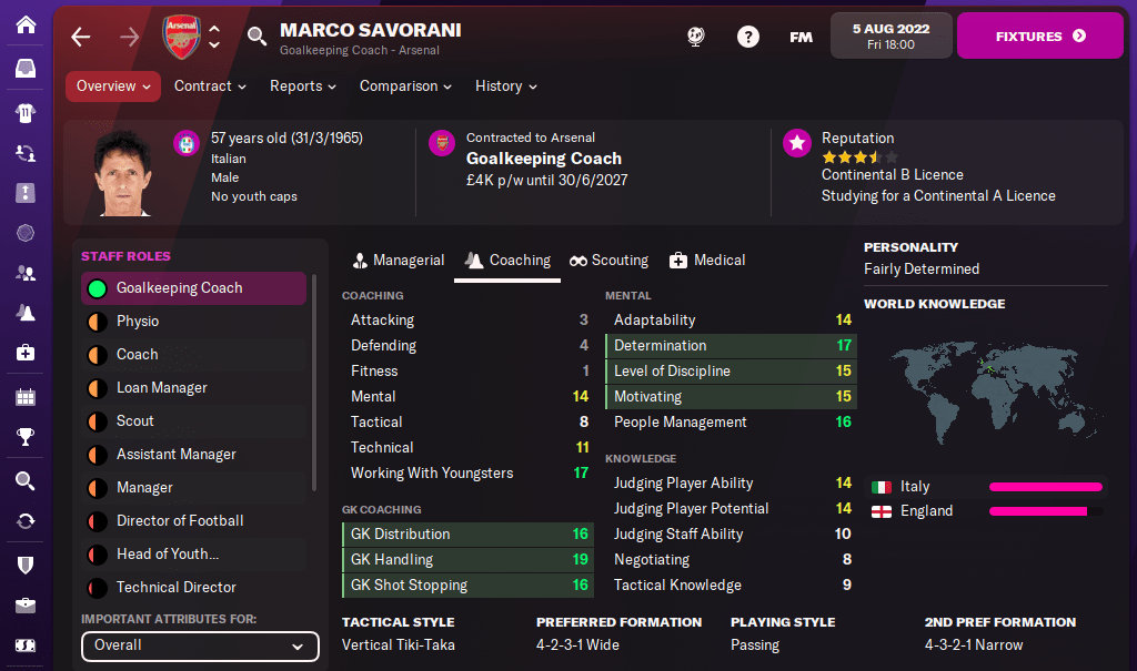 We also have a new goalkeeping coach in the aptly-named Marco Savorani. With those high attributes, we’ll just pretend he never worked for our arch-rivals Tottenham (he was on their staff during Antonio Conte’s brief tenure last season)!