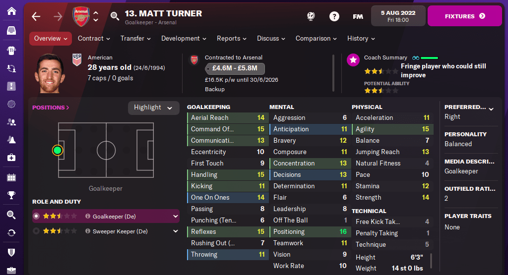 Three more players have joined us, including United States goalkeeper Matt Turner. Strictly speaking, he doesn’t meet any of my criteria for new signings – he’s 27, he’s not British or Irish, and he obviously wasn’t homegrown at Arsenal. However, as his transfer from New England was pre-arranged before my arrival, I’ve decided to make an exception for him. At any rate, he looks like a decent short-term backup to Ramsdale.
