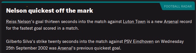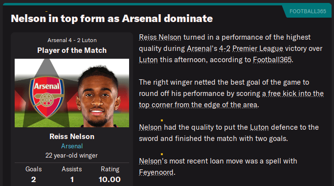 We then won four league matches in a row, including a 4-2 victory over PL newcomers Luton. After a slow start to this season, forward Reiss Nelson not only scored the fastest goal in Arsenal’s history, but he also got another goal and an assist – and finished with a perfect 10.0 match rating!