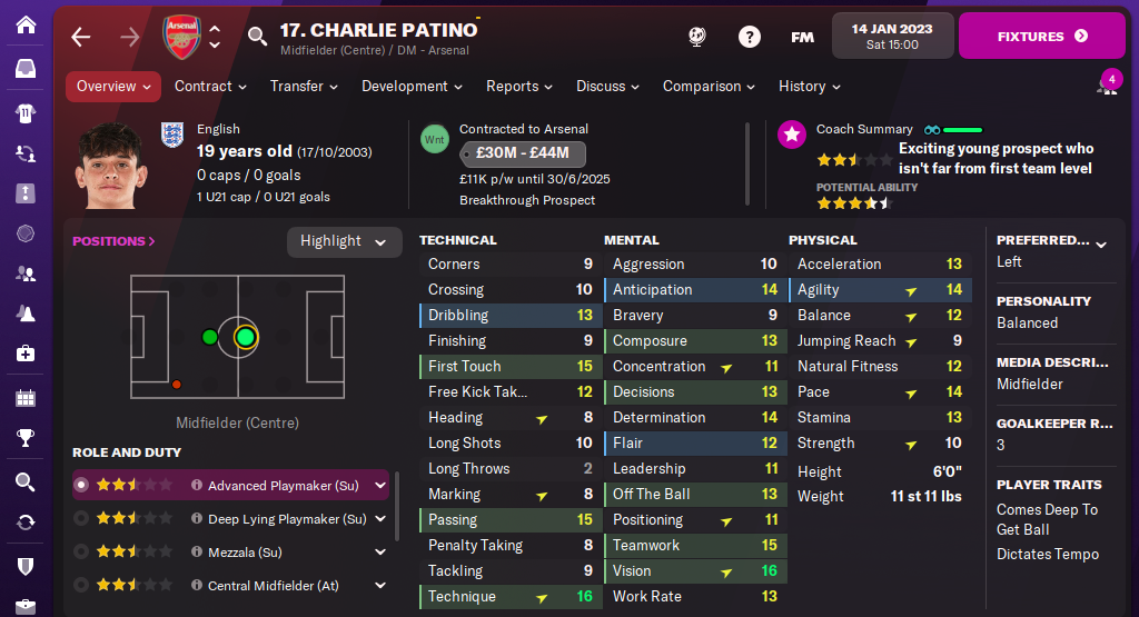 The sale of another midfielder to Milan for £35million left us with a gap to fill. This felt like the perfect time to recall Charlie Patino, who had been in consistently steady form for Middlesbrough in the Championship. With his Technique and Vision both climbing up to 16, and his other mental attributes on the rise, the 19-year-old now looked capable of playing in the Premier League.