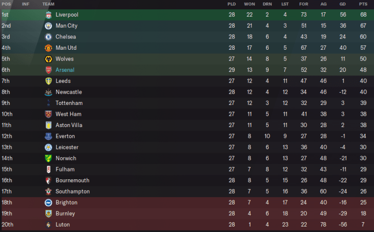 Here’s where that sorry run of form leaves us. Chelsea knocked us out of the top four in late January thanks to another ‘new manager bounce’, sacking the unpopular Diego Simeone after just six months and appointing Neil Bath as caretaker. Wolves leapfrogged us into 5th a month later, as they finally started to fulfil their potential under Bruno Lage.