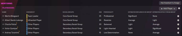 Putting a promising youngster in a mentoring group with experienced first-teamers can be an effective way of improving their personality and picking up useful traits. For this to work, the mentee has to be in the same squad as their mentor(s). In other words, you cannot simply ask Harry Kane to mentor Tottenham’s Under-18s strikers.