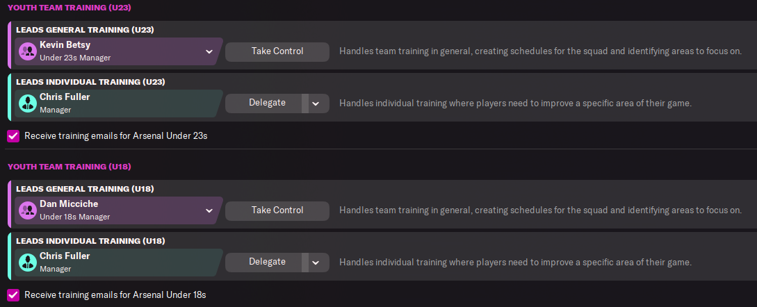 Leading individual training will allow you to manually change your players’ training focus, and the position/role/duty they train in. If you choose to lead general training as well, you have full control over the youth squad’s training schedules.