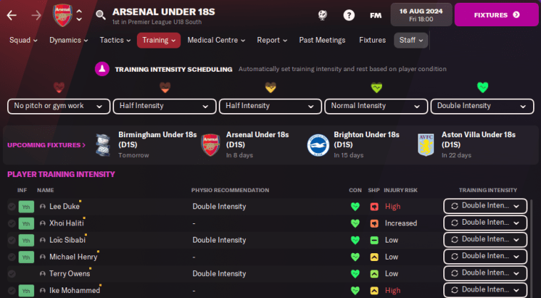 Another thing I might do is manage the squad’s training intensity. Go to Under-18s/19s > Training > Rest, and then set the training intensity based on their fitness levels, just like you would with your first-team. Training at double intensity can improve your players faster but also increases the risk of injuries, so try not to push your kids too hard.