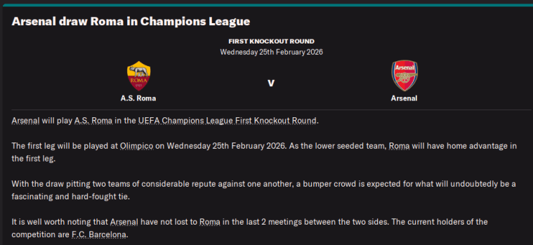 A Round of 16 tie with Roma, whom we beat twice on our route to the Final three seasons ago. The Giallorossi are mid-table in Serie A, and have just hired Zinedine Zidane to replace Tuchel as their head coach. I’m not too worried about them.