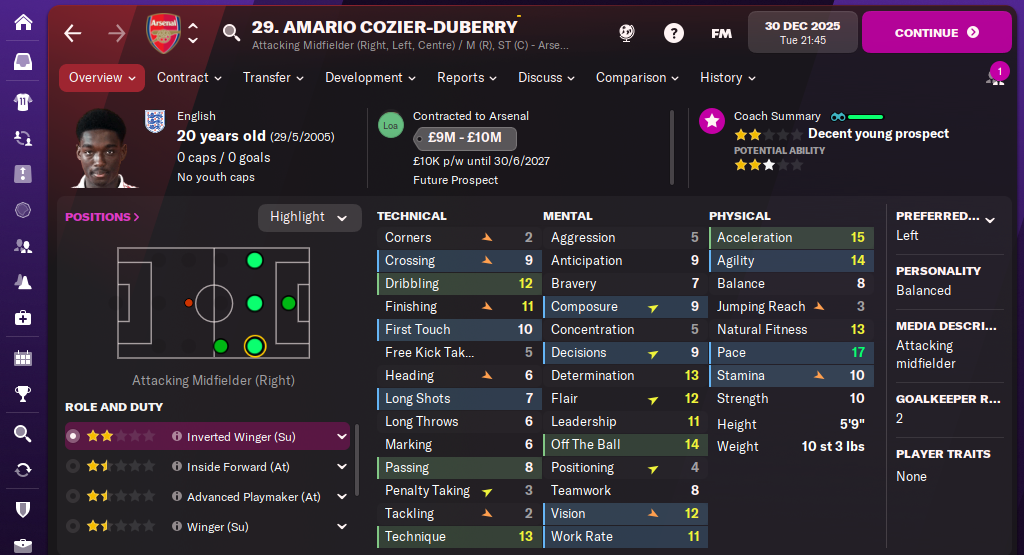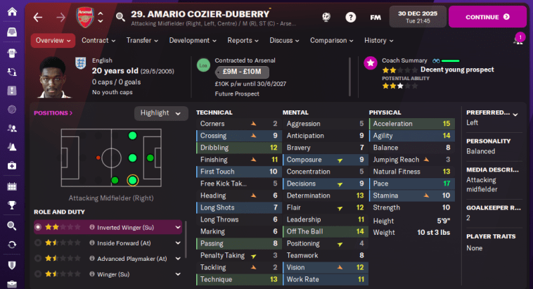 Even 20-year-old Amario Cozier-Duberry plays well whenever called upon, scoring three goals in nine games so far. Amario wasn’t an obvious hot prospect when I started this save, but he’s developed into a pretty handy winger who could yet make it in the Premier League. Another loan spell (perhaps at a top League One club) could do his development the world of good.