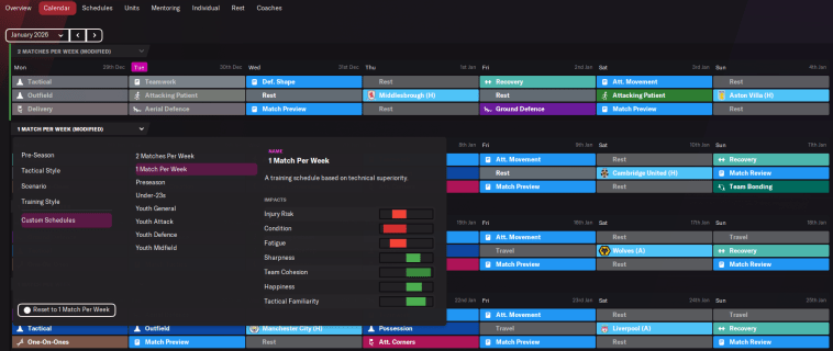 With the Under-18s, I like to mix it up a bit more. They rotate between FOUR schedules – one generic schedule, and three others which respectively focus on developing the attackers, midfielders, and defenders.