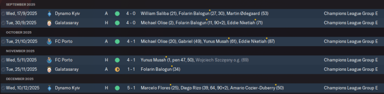 Having secured 1st place with time to spare, I used the final two group games to rotate my team and blood some of our younger talents. Though they were held to a 1-1 draw at Galatasaray, they produced a great comeback from 1-0 down to demolish Dynamo Kyiv 5-1 – with Mexico teenager Diego Rizo scoring THREE goals on his first Arsenal start!