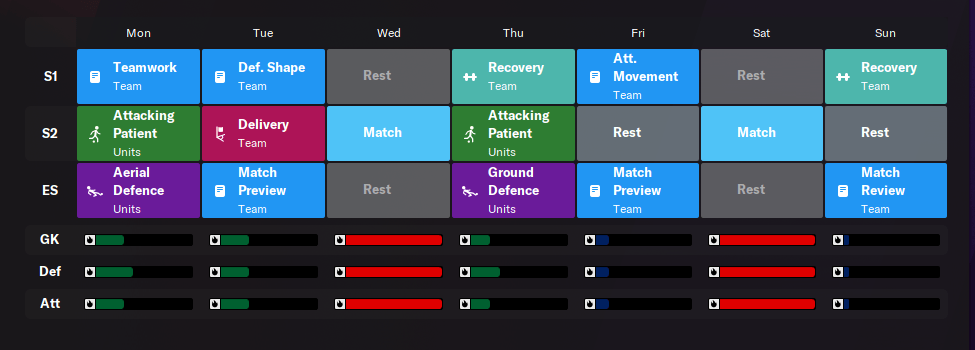 These are the two training schedules I mainly use for my senior and Under-23s teams, switching between them depending on whether we’re playing one or two matches in a given week. I try to give equal attention to the defensive and attacking units, while also making sure the goalkeepers have enough to work on too.