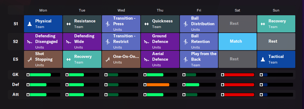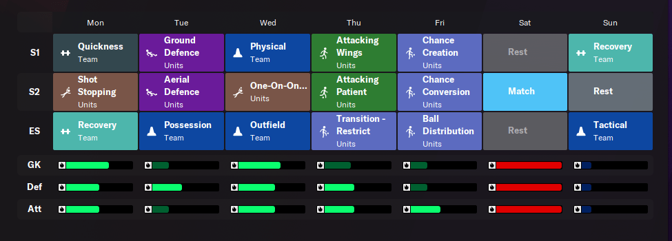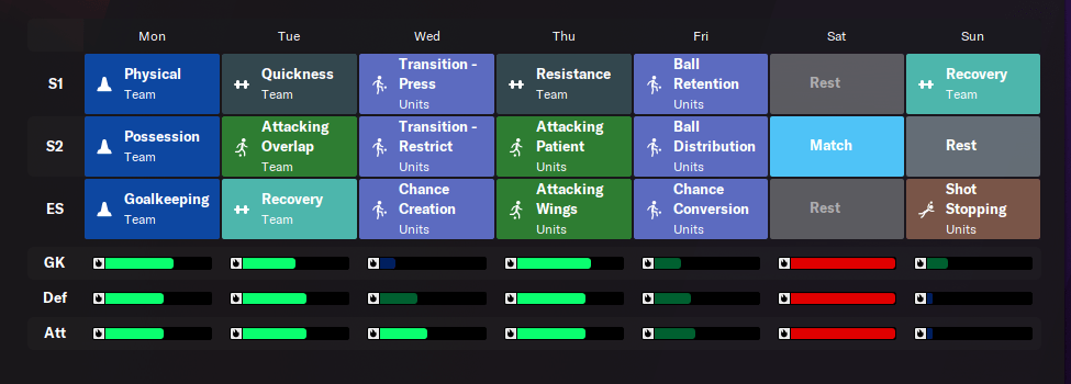 All these schedules have a few sessions dedicated to physical training, as physical attributes tend to improve faster while a player is still in their teens. I also make sure that the goalkeepers get some attention too.