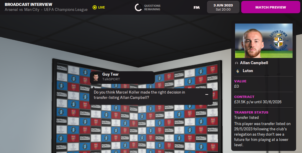 Press conferences have become more tedious too – not because the questions are repetitive, but because they’re largely irrelevant. 15 minutes before the Champions League Final, I don’t want to be asked about Luton’s manager putting a backup midfielder up for sale! Nor do I want to listen to any questions about my youth player’s loan spell at Reading before every single league match!