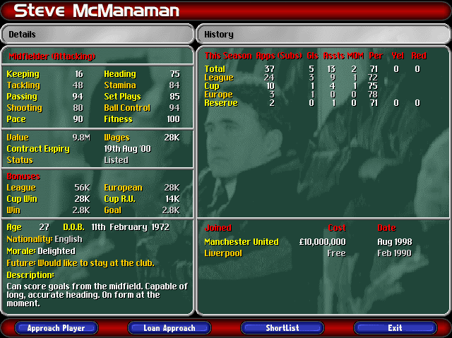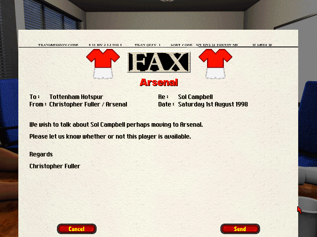On USM and USM2, transfers could effectively be completed in a day, but that wasn’t the case on USM98. To buy a player, you have to exchange faxes with the club over several in-game days to negotiate a fee. Then you must wait a few more days before the player’s agent faxes you to open contract negotiations (if the player is interested in joining, of course). The longer process might be frustrating, but it adds to the sense of realism.