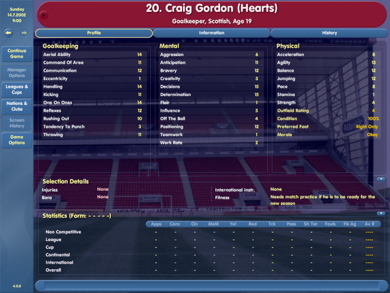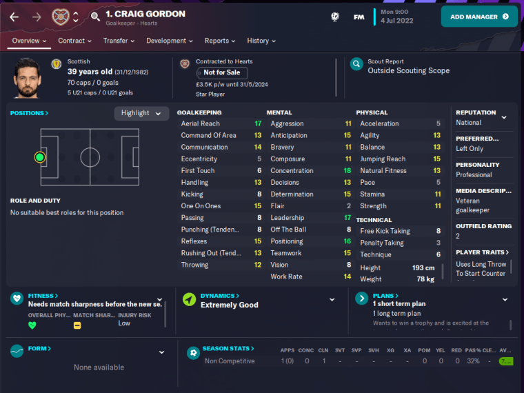 Gordon is the first man on this list who plays for the same club on both CM4 and FM23. Two decades ago, the Edinburgh-born teenager was the understudy to Hearts’ first-choice goalkeeper Tepi Moilanen, whom he displaced during the 2003/2004 season.