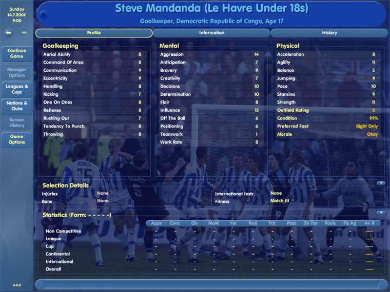 Looking at Mandanda’s CM4 profile, there’s not much to suggest this mediocre goalkeeper in Le Havre’s youth team would become a Ligue 1 stalwart and Les Bleus international. Born in Zaire (now the Democratic Republic of Congo), he moved to northern France when he was just two years old, but his French nationality is not on the game.