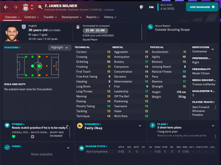 When Milner made his debut on Championship Manager 4, it was as an exciting winger, rather than a ‘boring’ utility player who is most often used as a midfielder or full-back. Indeed, when I played my first CM4 save with Arsenal, he was the very first player that I signed.
