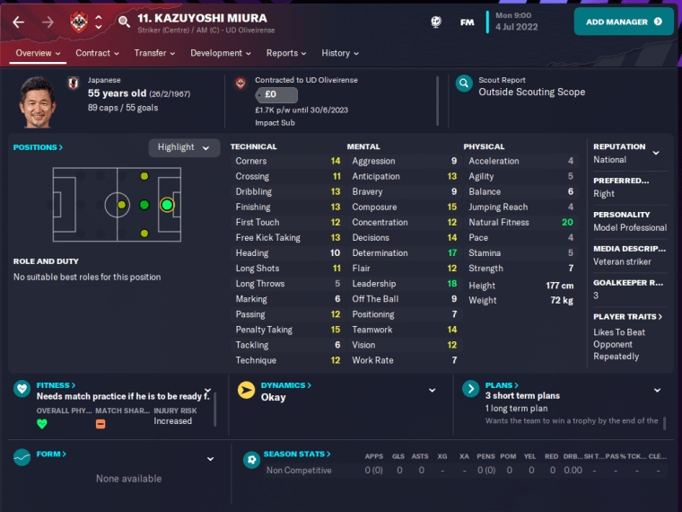 …until a few weeks ago. At the age of 55, Miura made a sensational return to Europe when he signed for Liga Portugal 2 side Oliveirense in January, which meant he was added to the game on FM23’s winter update. Although Kazu hasn’t yet made his Unionistas debut, FMers can now play with football’s ultimate survivor at long last!