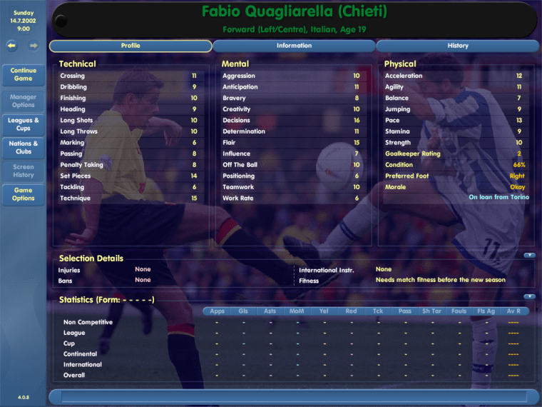 Italian football has its fair share of late-bloomers, and you could make a case for putting Quagliarella in that group. On CM4, he was an adequate if unremarkable 19-year-old striker whom Torino had loaned out to Chieti in Serie C1.