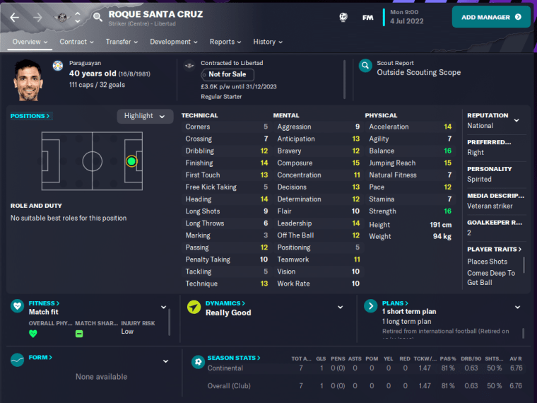 When it came to CM4, the Paraguayan striker was midway through an eight-year spell at Bayern München, with whom he’d already won the Champions League in 2001. He then headed for the Premier League, scoring plenty of goals for Blackburn (where he was briefly renamed Satna Cruz) before a less successful stint at Manchester City (in the early stages of Sheikh Mansour’s sky-blue revolution).