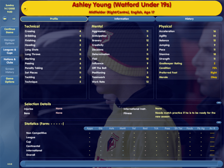So yeah… this is how Ashley Young looked as a 17-year-old. With 4 Crossing, 4 Dribbling and 5 Technique, this right-winger really didn’t look like he would make it at Watford, let alone Manchester United.