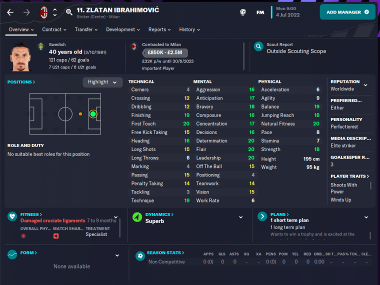 On CM4, you will find Ibrahimovic at Ajax, who had lured him from his hometown club in 2001. His 13 Finishing is on the low side – and perhaps also his 19 Determination – but this is clearly the aggressive and flamboyant centre-forward we know and love. (Or hate, if you’re a Pep Guardiola fan.)