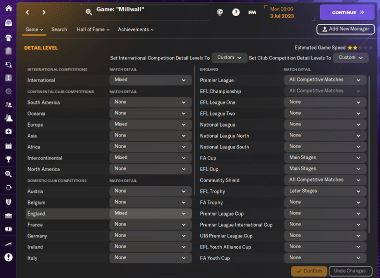 By default, all matches in your league will be simmed in full detail. For all other nations and competitions, you can choose whether you want All Competitive Matches, the Main Stages, or just the Later Stages simmed in full detail. If you set Match Detail to None, every match in that competition will be quick-simmed with the QME.
