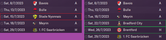FM arranges friendlies for your team while creating the game, but you can still make changes. In my example, I cancelled a match that was scheduled just two days after another fixture. I also set up friendlies away to Bradford (a step up in class after playing three weak Swiss teams) and at home to Brentford (to test us against stronger opposition). Our other home game was against Saarbrücken – a German 3rd-division team.
