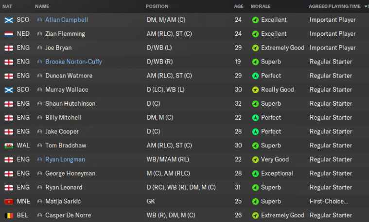 Another thing you’ll want to look at nice and early is your players’ agreed playing time. Certain players can get upset if you don’t give them as much playing time as expected or as promised. This can be a real problem if you have more than 11 players whose agreed playing time is Regular Starter or higher – my Millwall squad had 15 when I took over!