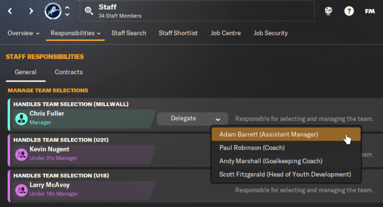 Part of the beauty of Football Manager is that you can do as much or as little as possible. Pretty much any managerial task can be delegated to another member of staff, which you can set on the Responsibilities tab of the Staff screen.