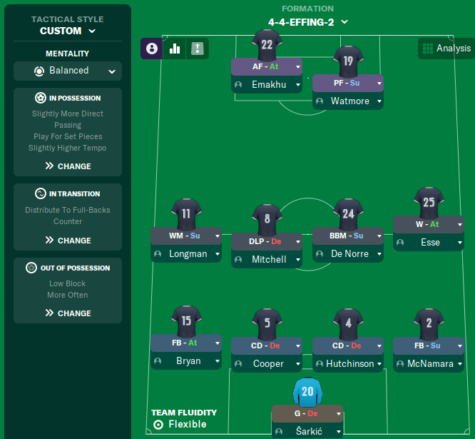 Having a quick striker like Emakhu alongside a hard-working pressing forward like Bradshaw or Duncan Watmore would solve the isolation issue and give us more options in attack. The talented Billy Mitchell would dictate play from midfield, and provide defensive cover when Joe Bryan bombed forward to deliver crosses from left-back. Yes, we were sacrificing some defensive stability (as you’ll soon see), albeit for the greater good…