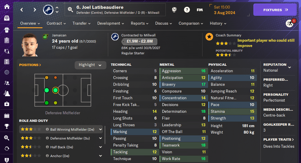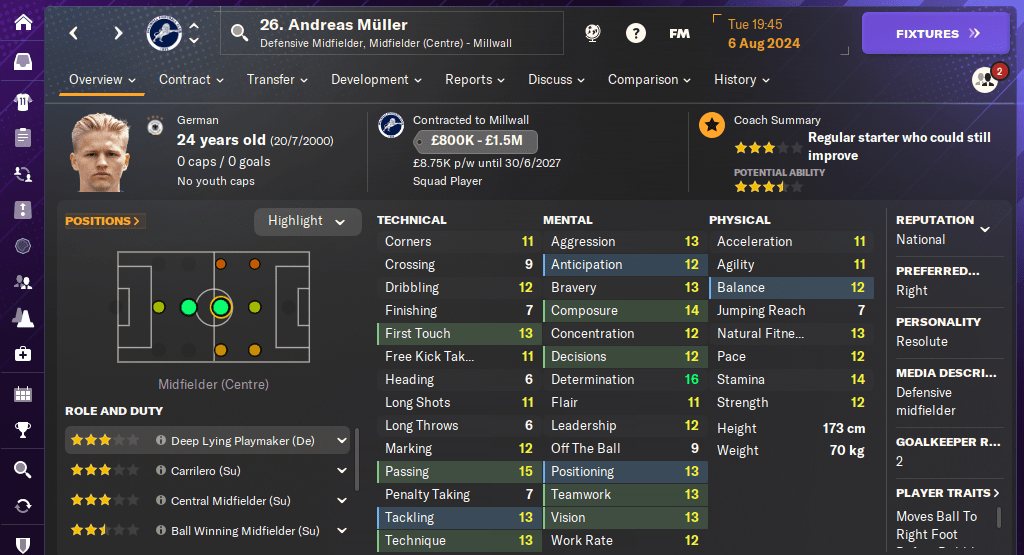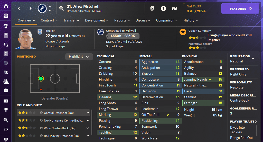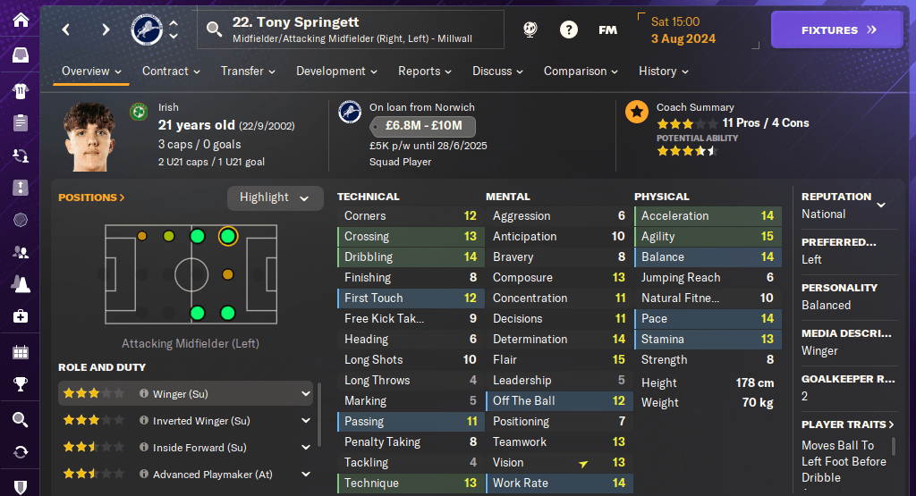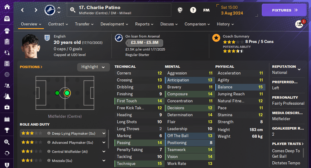 After missing out on Tony Springett last season, we finally managed to bring the pacey Irish winger (and boyhood Millwall fan) to The Den on loan from Norwich. Our third and final loanee is Charlie Patino – the skilful 20-year-old playmaker who you might remember from my FM22 Arsenal academy series. Charlie’s former Gunners team-mate Mika Biereth joins on a free transfer to provide more depth up front.