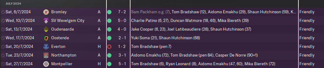 Couldn’t ask for much more than that. Some solid wins, a 5-1 thumping of a very strong Montpellier side, and just one valiant defeat at home to Sean Dyche’s Everton. Mind you, I’m not quite sure how we managed to concede twice to non-league Bromley.
