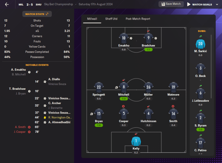 After a narrow loss to relegated Luton (and their new manager Jack Wilshere), I abandoned the 4-4-2 and switched to a 3-4-3 for our next home game against Southampton. Biereth netted his first Millwall goal to cancel out an early Saints opener… and three minutes later, the young Dane found the net again.