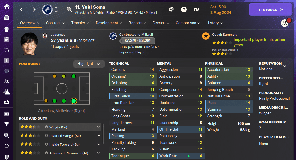The new signing I was most excited about was right-winger Yuki Soma, who signed a three-year deal after leaving Casa Pia in Portugal. In nearly 25 years of playing Championship Manager or Football Manager, I believe Yuki is the first Japanese player I have ever signed (Takehiro Tomiyasu was already at Arsenal at the start of my FM22 series).