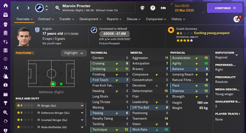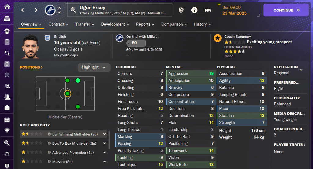 In terms of this year’s intake, our hottest prospect is Uğur Ersoy, an aggressive but energetic midfielder and winger who already looks decent technically. I might be more excited about Nigerian striker Bala Francis, with his explosive pace and 14 Finishing… if he didn’t also have low ambition and rock-bottom determination.