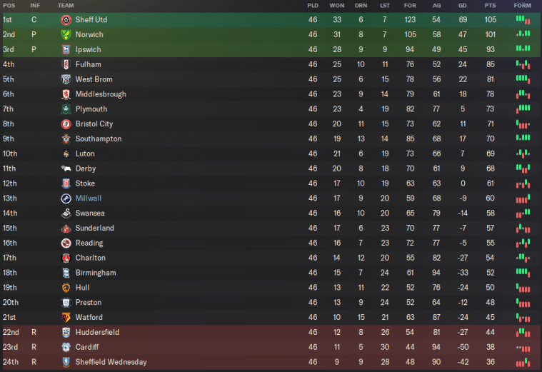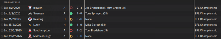 We went through the motions in our remaining fixtures, in which I experimented with tactics and gave some opportunities to Nethercott and Sheringham. Our losing streak extended to six matches, including a total trainwreck at West Brom where we were 2-1 up in the 70th minute and somehow lost 5-2!