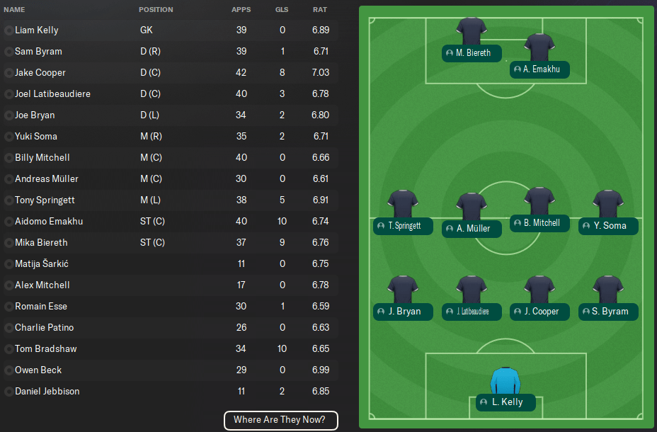 Once again, we only had a single player record an average match rating over 7.00. Although our defence basically checked out after February, Coops was the one man I could consistently rely on… for the most part. Loanees Springett and Beck were our next-best performers, and despite making a few sloppy mistakes in goal, Kelly also put in enough blinders (and magical penalty saves) to keep his rating at an acceptable level.