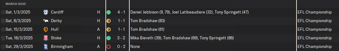 We went through the motions in our remaining fixtures, in which I experimented with tactics and gave some opportunities to Nethercott and Sheringham. Our losing streak extended to six matches, including a total trainwreck at West Brom where we were 2-1 up in the 70th minute and somehow lost 5-2!