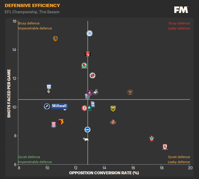 But then again, we’ve shown that we can go toe-to-toe with the toughest teams in the Championship and survive a lot of stormy weather. Our opposition shot conversion rate is the lowest in the league (10%), while our defenders are among some of the best when it comes to winning headers and tackles.