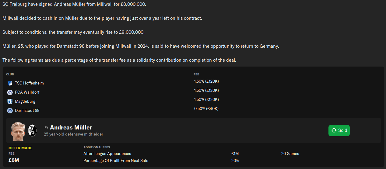 After a difficult first season in south London, Müller had thrived upon finding his role as a midfield runner – 4 goals and 4 goal contributions in 21 league games. While I didn’t really want to let him leave so soon, the prospect of a huge profit softened the blow. Auf wiedersehen, Andi.