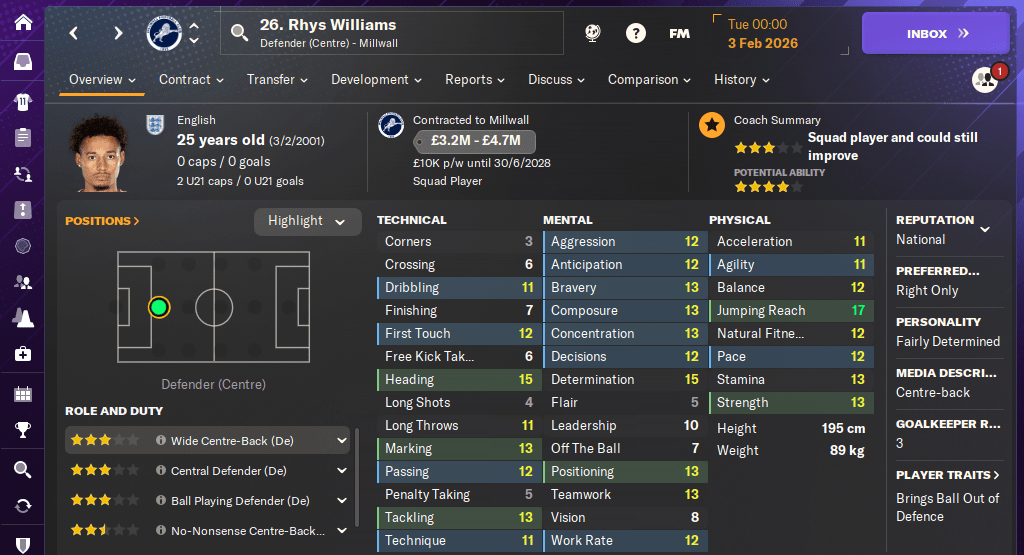 I then brought in one more defender on deadline day – bringing in Rhys Williams for £325,000 from Liverpool. He’s a big, tall man (which I love) who’s fairly determined (which I also love) and he apparently enjoys big matches (we’ll see).