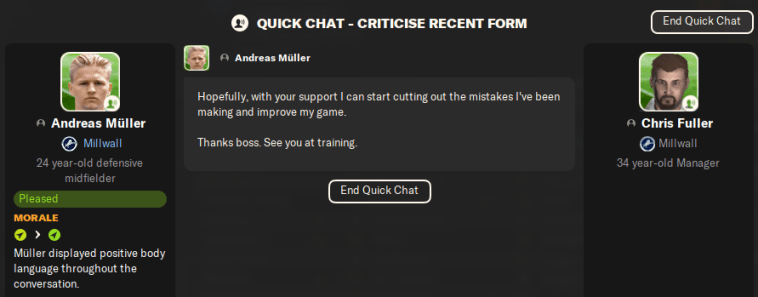 Player interactions have been improved too – with players giving clearer positive, negative or neutral responses to your praise, criticism or suggestions.