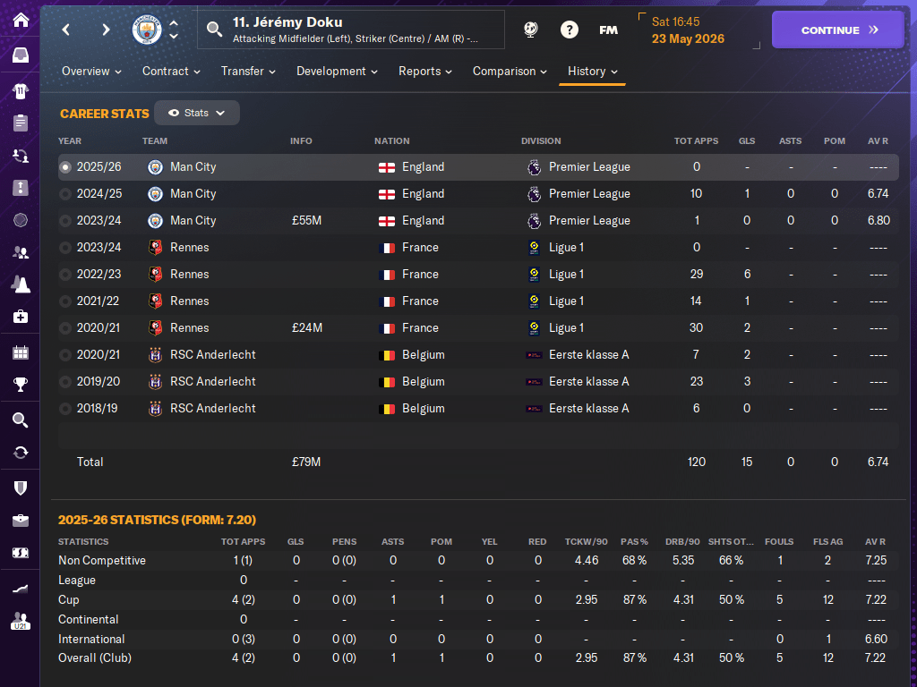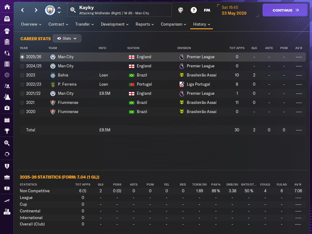 This happened a lot to some of Manchester City’s hottest prospects on my save – like midfielder James McAtee, who spent a season on loan at Sheffield United, and then rotted in City’s Under-21s for two years before escaping to Chicago on a free transfer. The Citizens also wasted the talents of £55million man Jérémy Doku (who didn’t play a single league game in 2025/2026) and Kayky (who hasn’t played ANY competitive football for two-and-a-half years!).