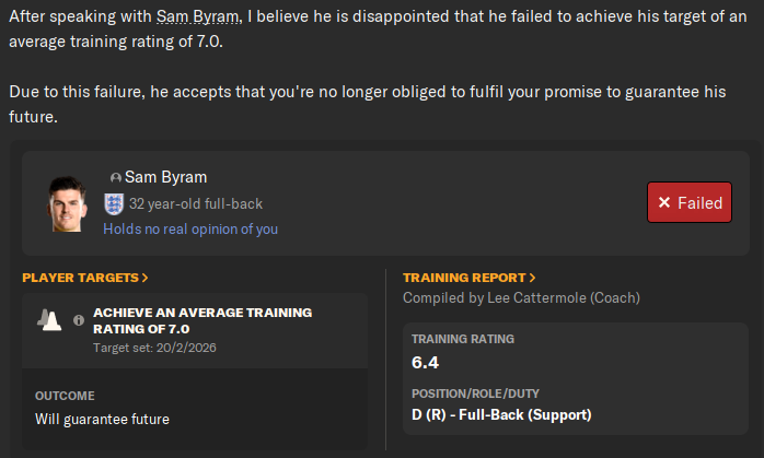 If a player is regularly struggling to perform in matches or in training, you can try to inspire them by setting them targets, usually in return for reassurances about their future. For example, you can promise to make a striker a Regular Starter next season if they score 15 goals in the current campaign.