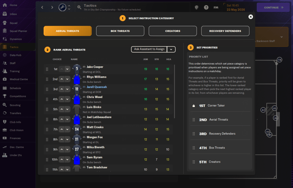 My single favourite new feature is the set-piece editor, which SI have ripped out and rebuilt. You can set specific roles for each set-piece routine, and these will be assigned based on priority lists rather than by positions. Never again will you have to wonder why your giant defender is staying behind when you win an attacking corner.