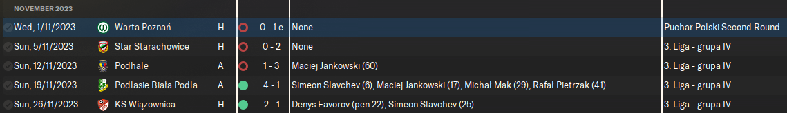 Next up was a daunting trip to Podhale, who were on a sensational run that had catapuled them to top spot. The result was not a surprise goals. Wieczysta shipped three more goals and three more points, leaving them NINE adrift at the halfway stage. Serious questions were now being asked about whether Kamila was the right manager for the job.