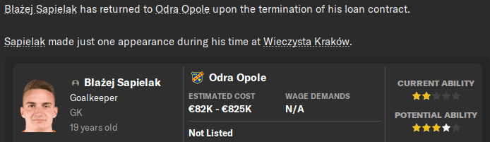 Sapielak had started both away matches, and the loanee goalkeeper had conceded each of the first four shots on targets he had faced. Kamila was already feeling blasé about Błażej, and she calmly told him, “Pack your bags. I’m sending you back to Odra Opole.”