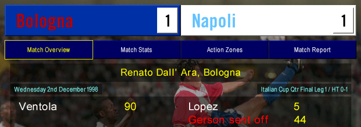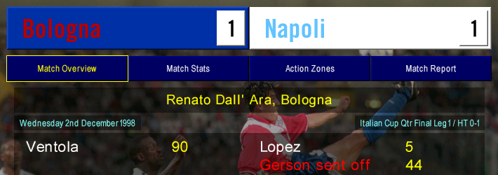 Napoli were on their worst run of the season, having gone a whole TWO games without a win. How, then, did you imagine we would get on in the first leg of our Coppa Quarter Final – away from home against a Bologna team starring the likes of Gianluca Pagliuca and Nicola Ventola?